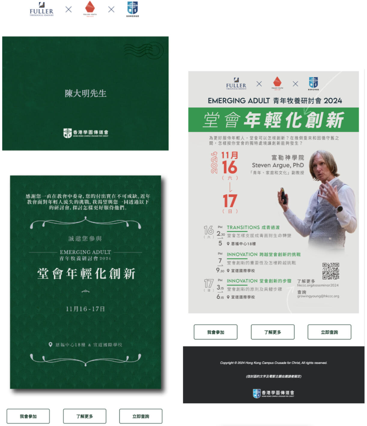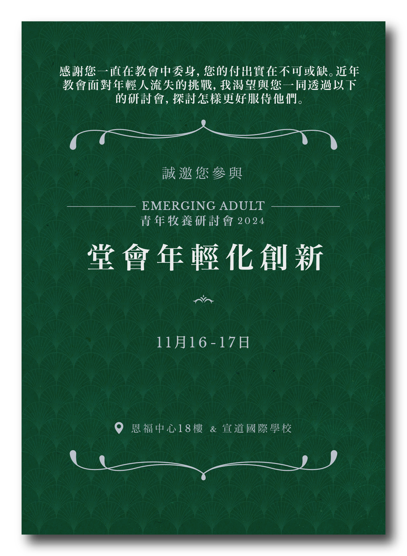 年輕人的牧養及堂會的創新需要多人的攜手合作,鼓勵你邀請更多愛年青人的牧者、導師、長執等一同參與,你可以下載下面的海報或邀請卡發送 給你的邀請對象。