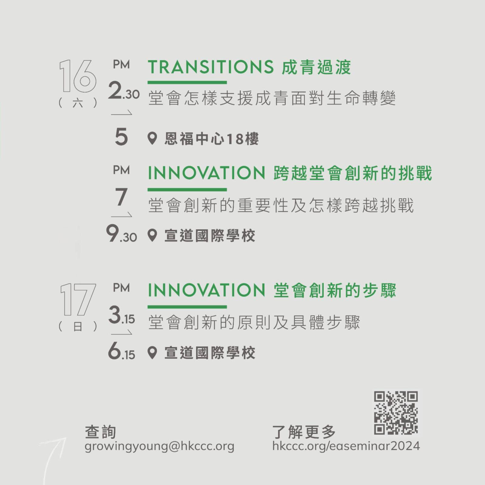 作為教會,我們均希望能在年輕人最需要我們的時間和地方出現,並伸出援手,富勒神學院從最新的研究中發現,成青最需要教會的時候,就是他們在這個人生階段:他們可能會面對的七個重大生命轉變。教會可以怎樣讓他們在過渡中感受到被支援呢?Innovations 堂會創新
